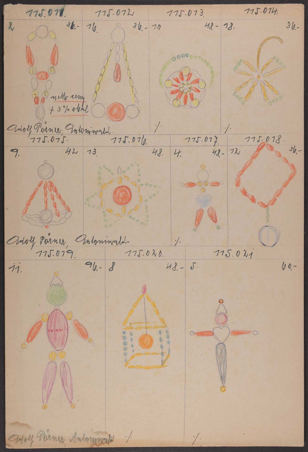 Adolf Pörner, Antoniwald/Antonínov, Musterkarte für die Produktion von Christbaumschmuck aus Gablonz/Jablonec nad Nisou Buntstift, Bleistift, Tusche auf Karton © MAK