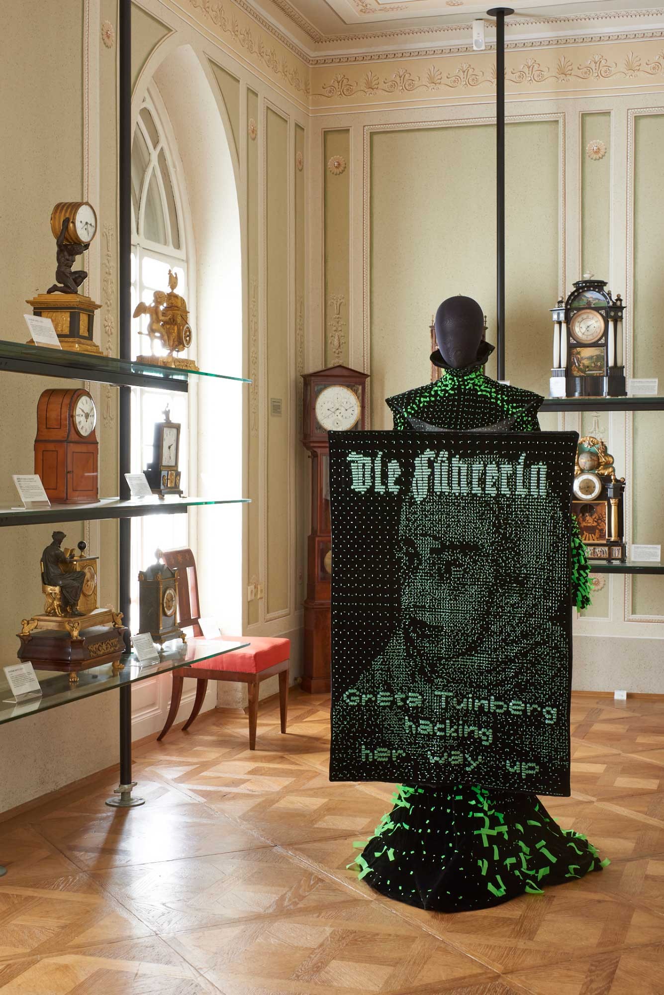 MAK Exhibition View, 2023, (CON)TEMPORARY FASHION SHOWCASE: Flora Miranda, Time to Tech Up Dress from the collection of the same name with six exchangeable textile panels, here: Die Führerin [The Leader] „Greta Tuinberg“, 2020, MAK © MAK/Georg Mayer