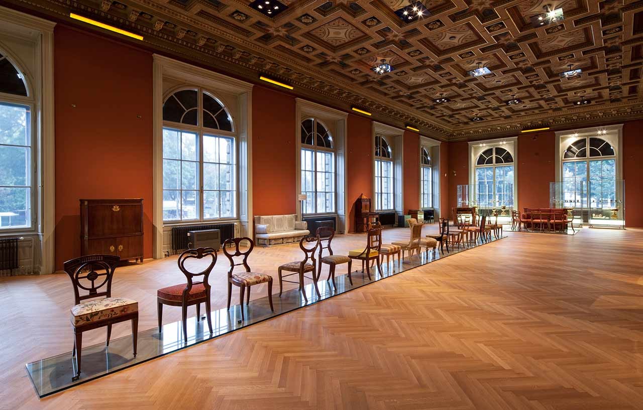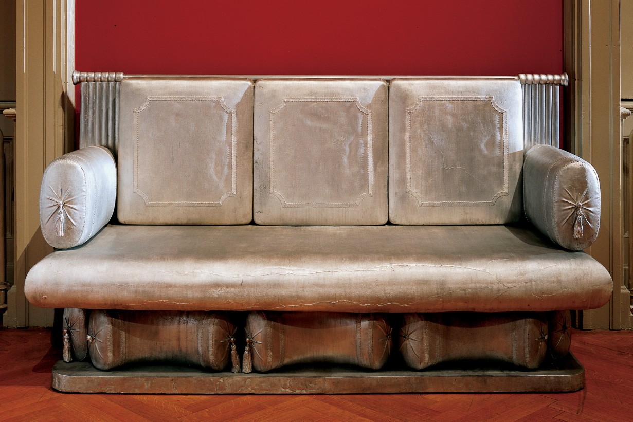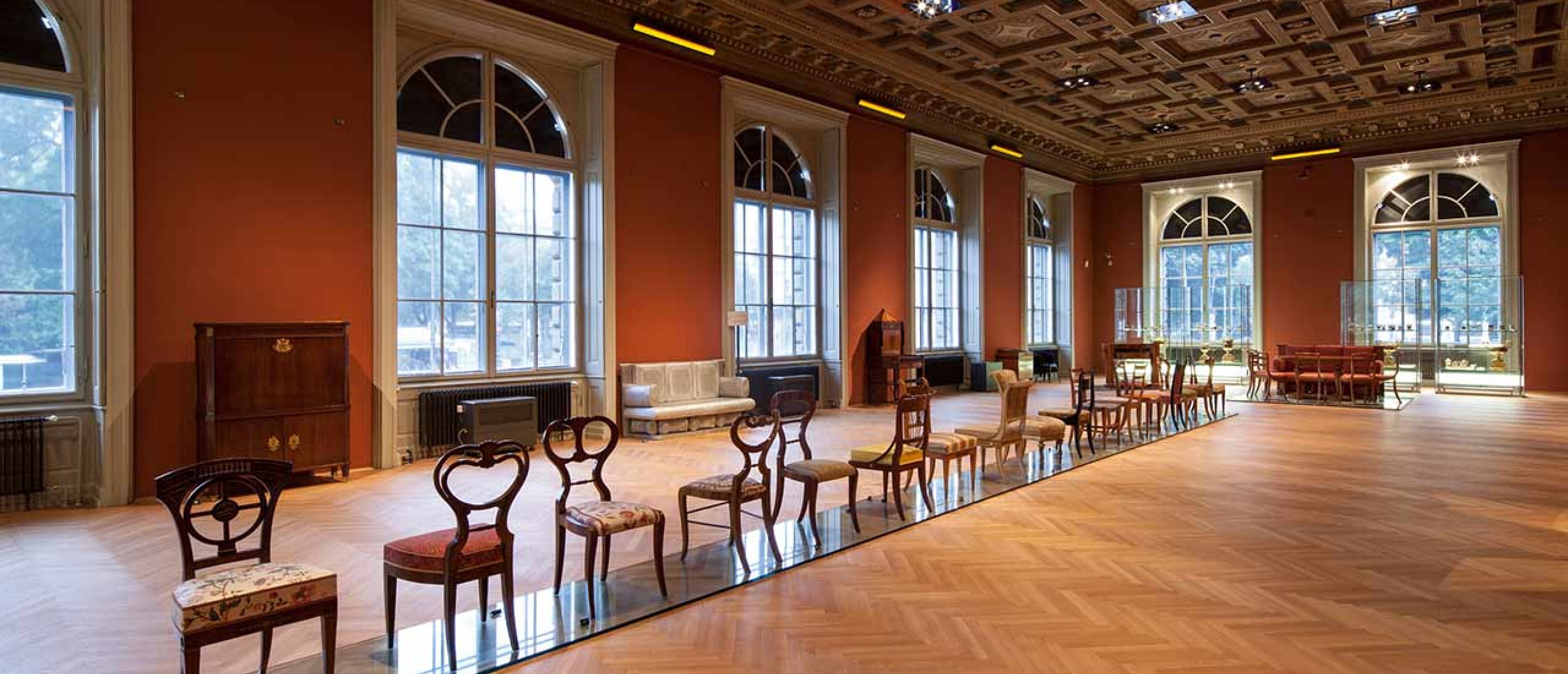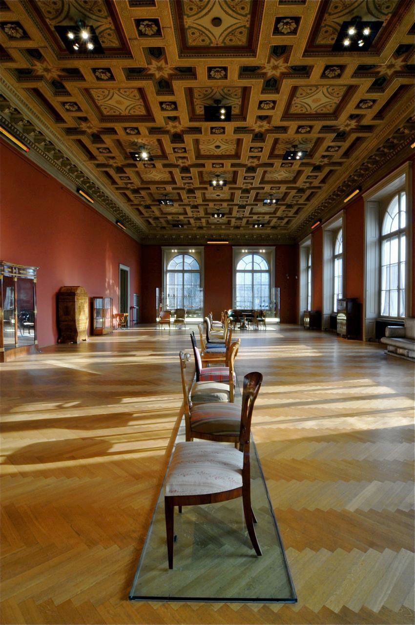 The aluminum sofa Jenny Holzer placed in the room as an artistic intervention immediately catches the eye. This bench was created based on a Biedermeier sofa displayed in the exhibition room, which cannot be used as it is a museum exhibit. In contrast, Holzer’s copy precisely cast in aluminum in every detail serves as a resting place from which museum visitors can take their time to observe the space. However, the difference between the original and the copy immediately becomes apparent: