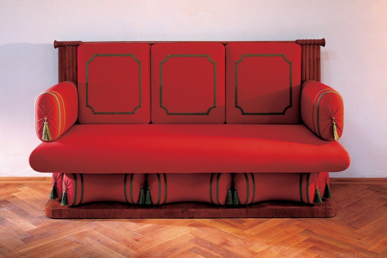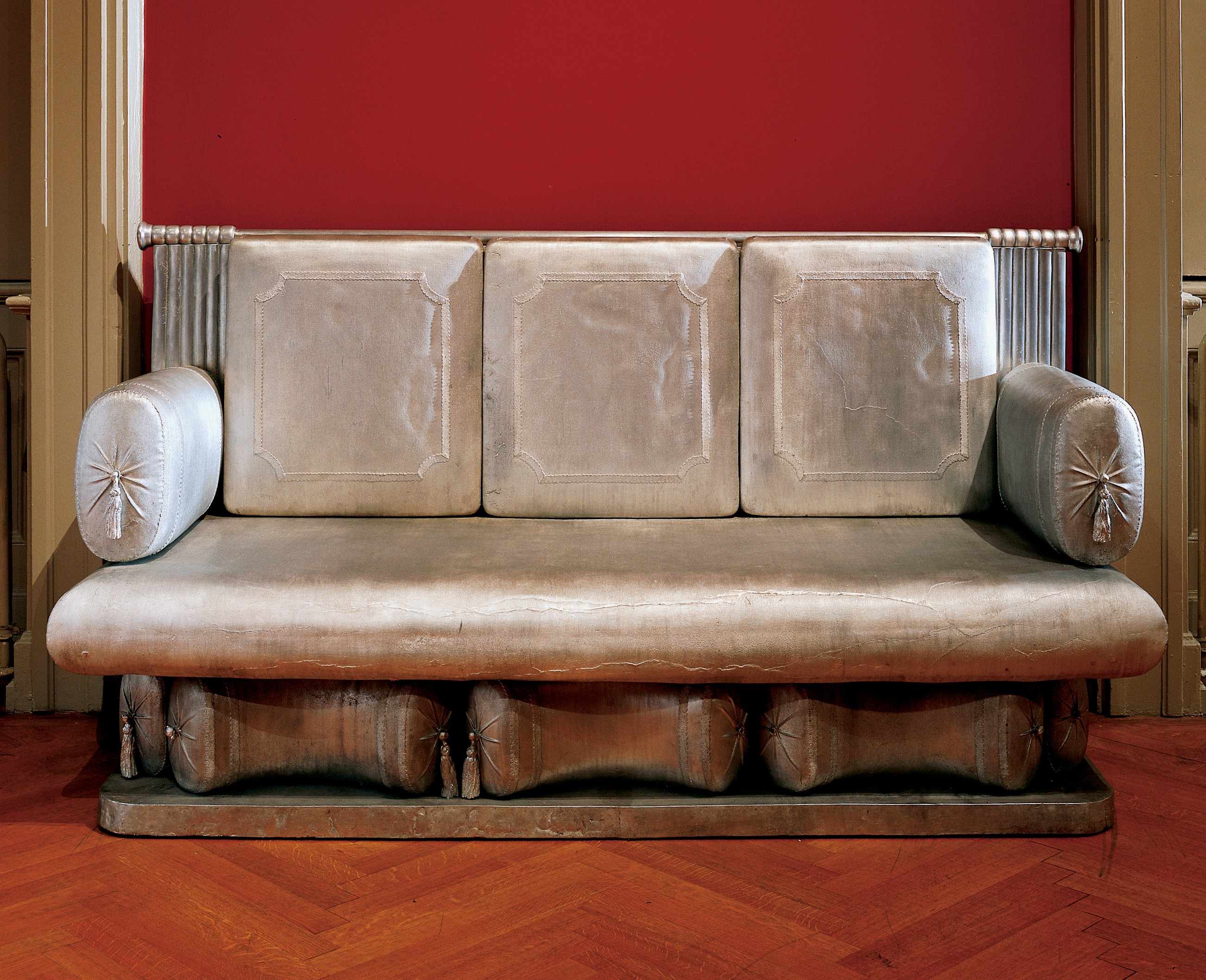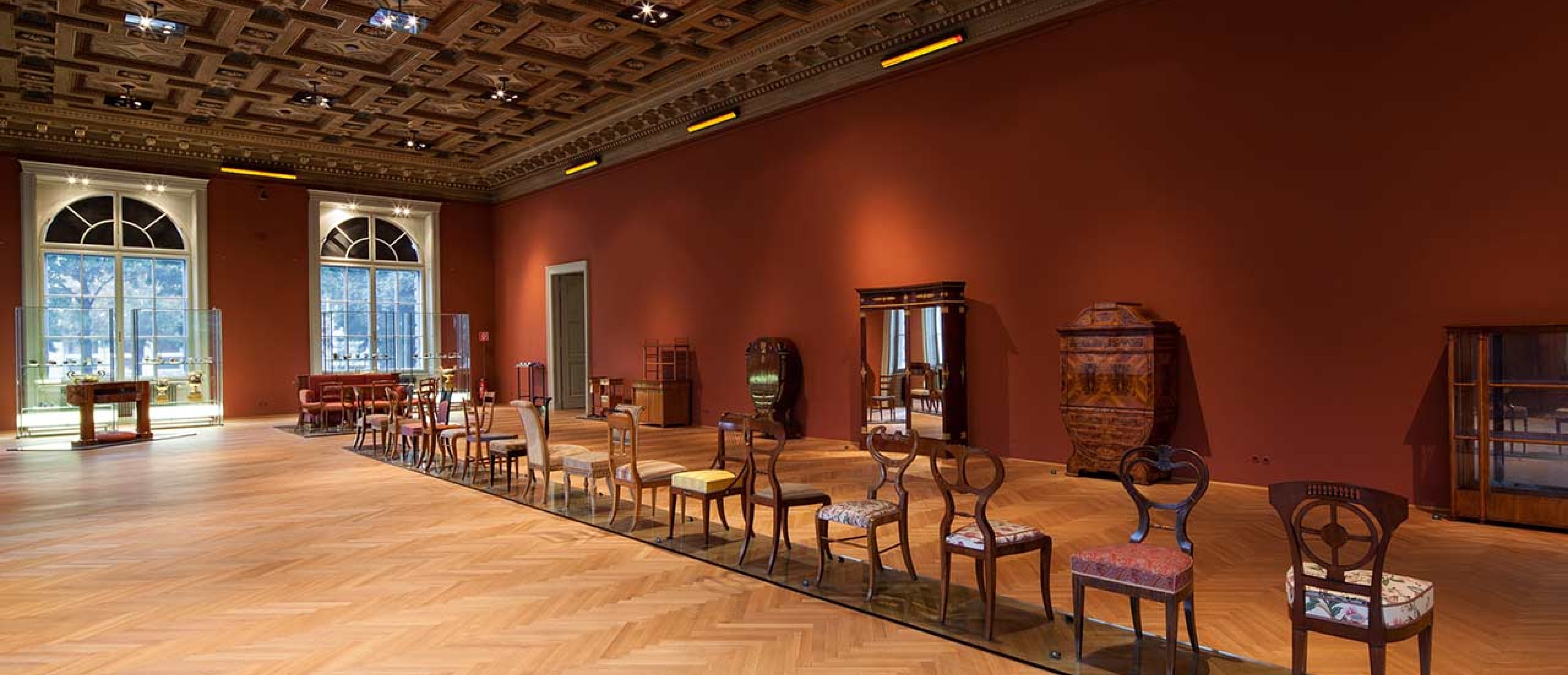 The aluminum sofa Jenny Holzer placed in the room as an artistic intervention immediately catches the eye. This bench was created based on a Biedermeier sofa displayed in the exhibition room, which cannot be used as it is a museum exhibit. In contrast, Holzer’s copy precisely cast in aluminum in every detail serves as a resting place from which museum visitors can take their time to observe the space. However, the difference between the original and the copy immediately becomes apparent: