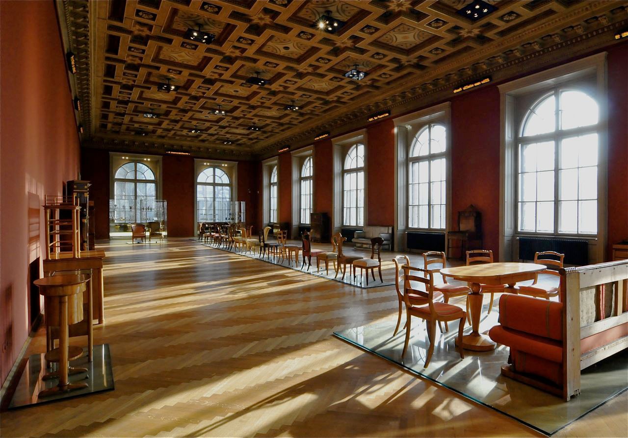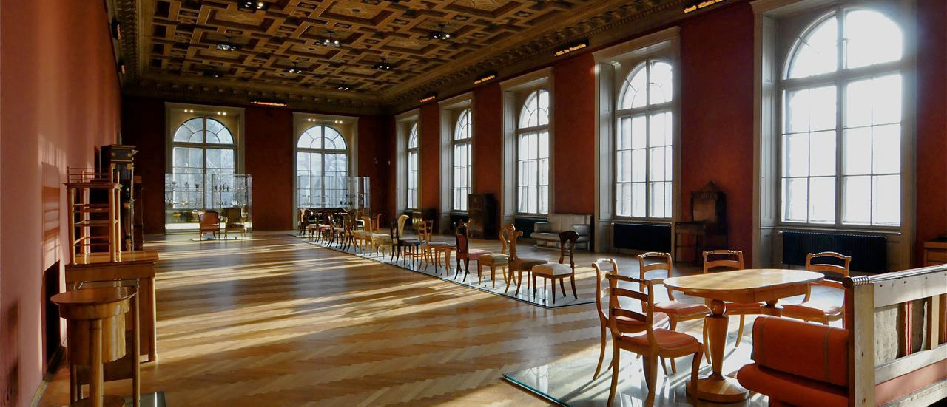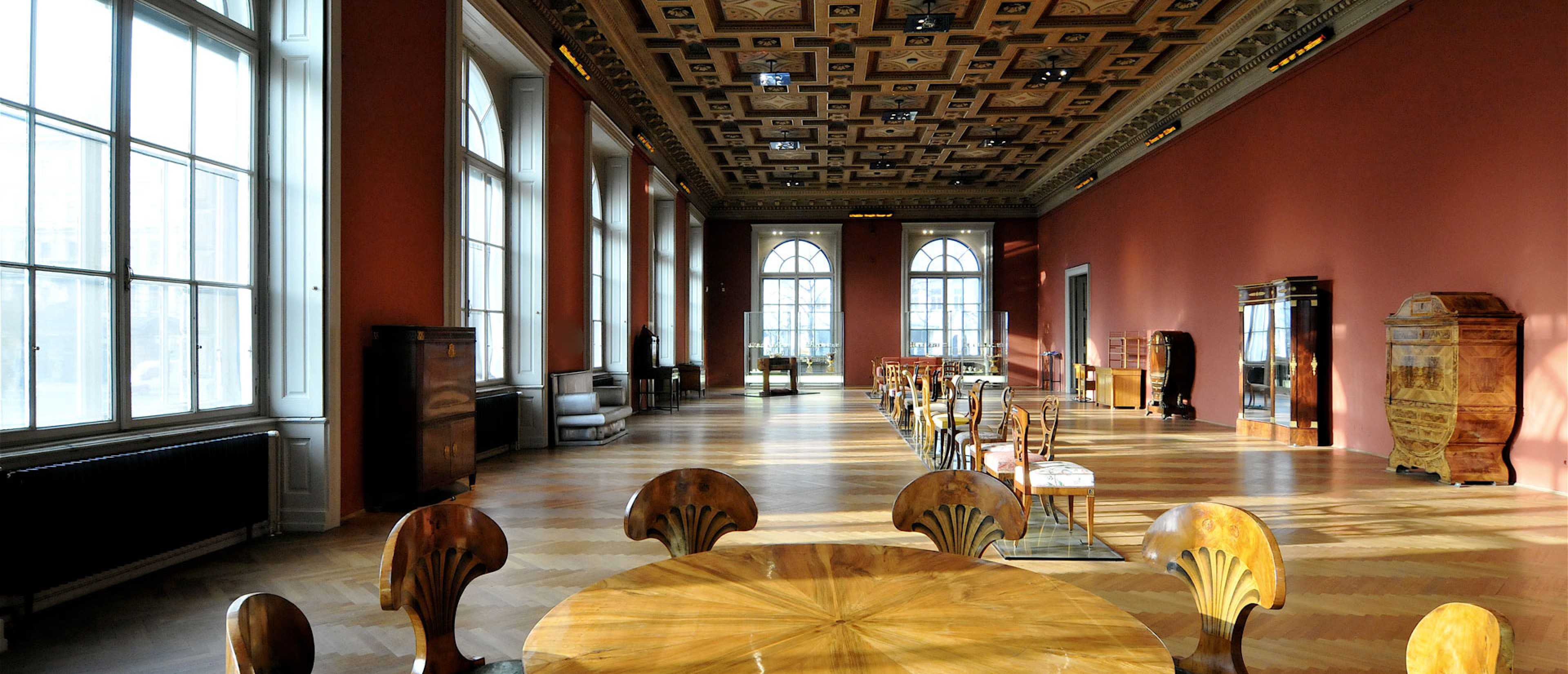 More armchairs as well as furniture from bourgeois and royal-imperial households impressively illustrate the explosion of forms during this era. The showcases at the front end of the room display porcelain cups in an unlimited array of flavors, glasses as the carriers of the most diverse information, and silver works with characters unfolding between simplicity and decoration.