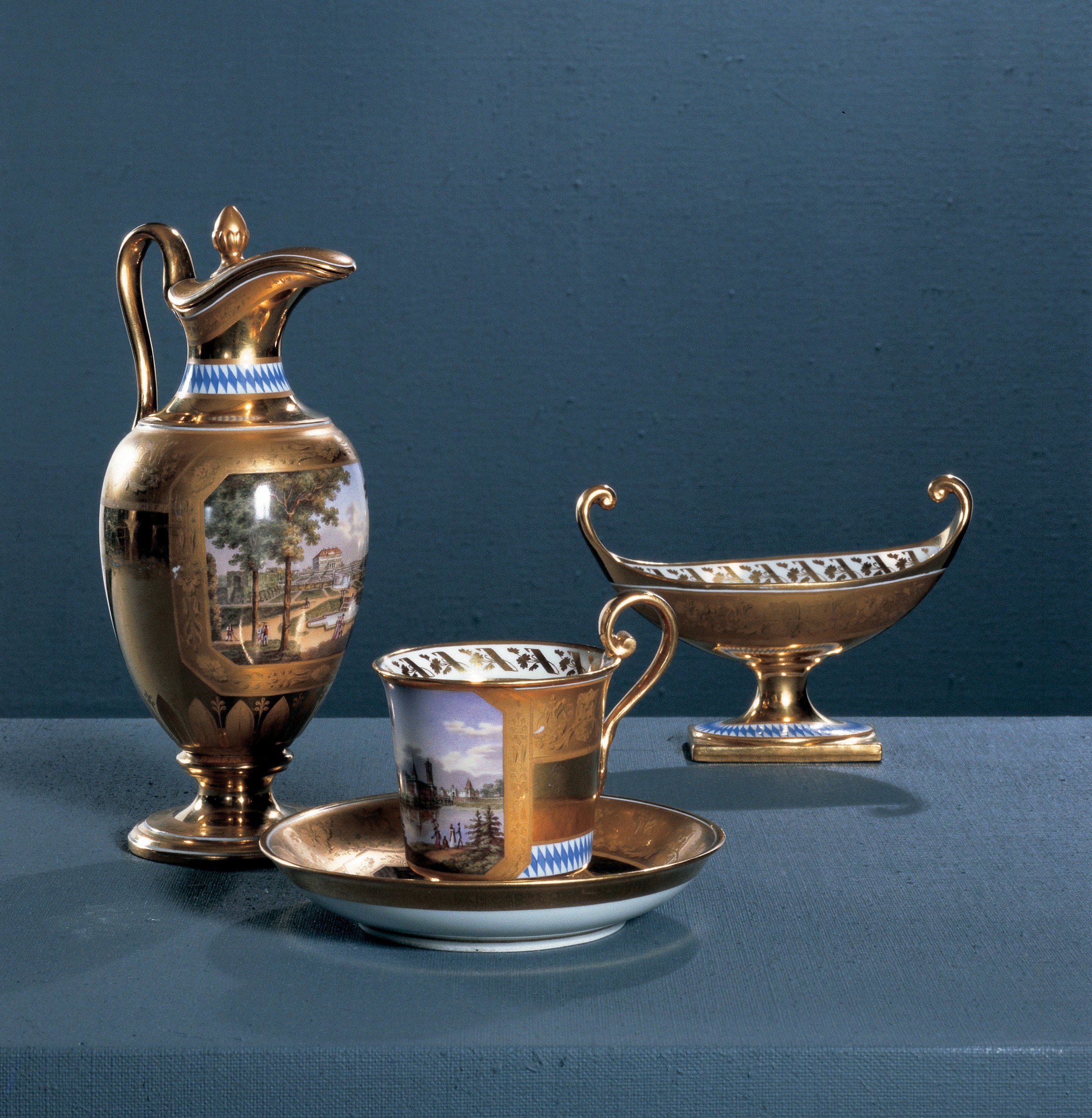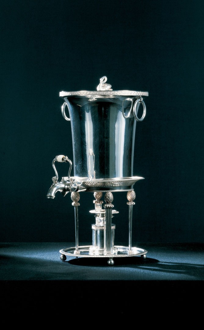 Accordingly, the selection of objects exhibited in this room primarily showcases the design and material diversity of everyday items from the era of Empire Style and Biedermeier alongside individual decorative arts highlights of the Austrian monarchy. Directly upon entering the room, two armchairs standing next to each other document the simultaneously existing yet aesthetically fundamentally different styles of Empire and Biedermeier—one representative with velvet upholstering and neo-classical decorative elements, the other less decorated and simpler but with high-quality wooden craftsmanship. Intriguingly, both armchairs were produced by the same Viennese furniture manufacturer at the same time: Joseph Ulrich Danhauser.