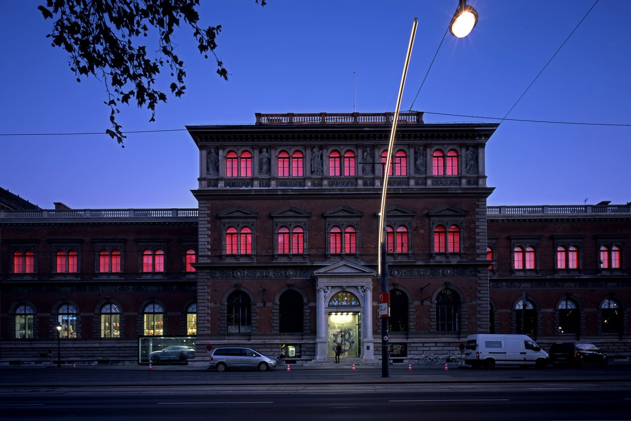 James Turrells Lichtskulptur MAKlite lässt intensives, verschiedenfarbiges Licht in den Fenstern des MAK pulsieren und kommuniziert die komplexen Verhältnisse, die im Inneren des Museums geschaffen werden, in die städtische Umgebung. Seit 2004 permanent eingerichtet, enthebt diese Installation die Ziegelsteinfassade ihrer statischen Geschlossenheit.