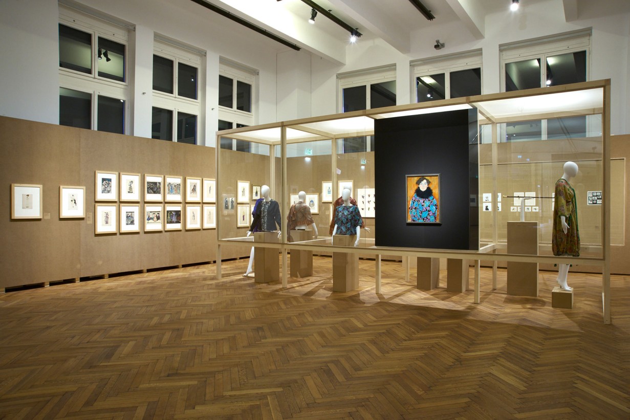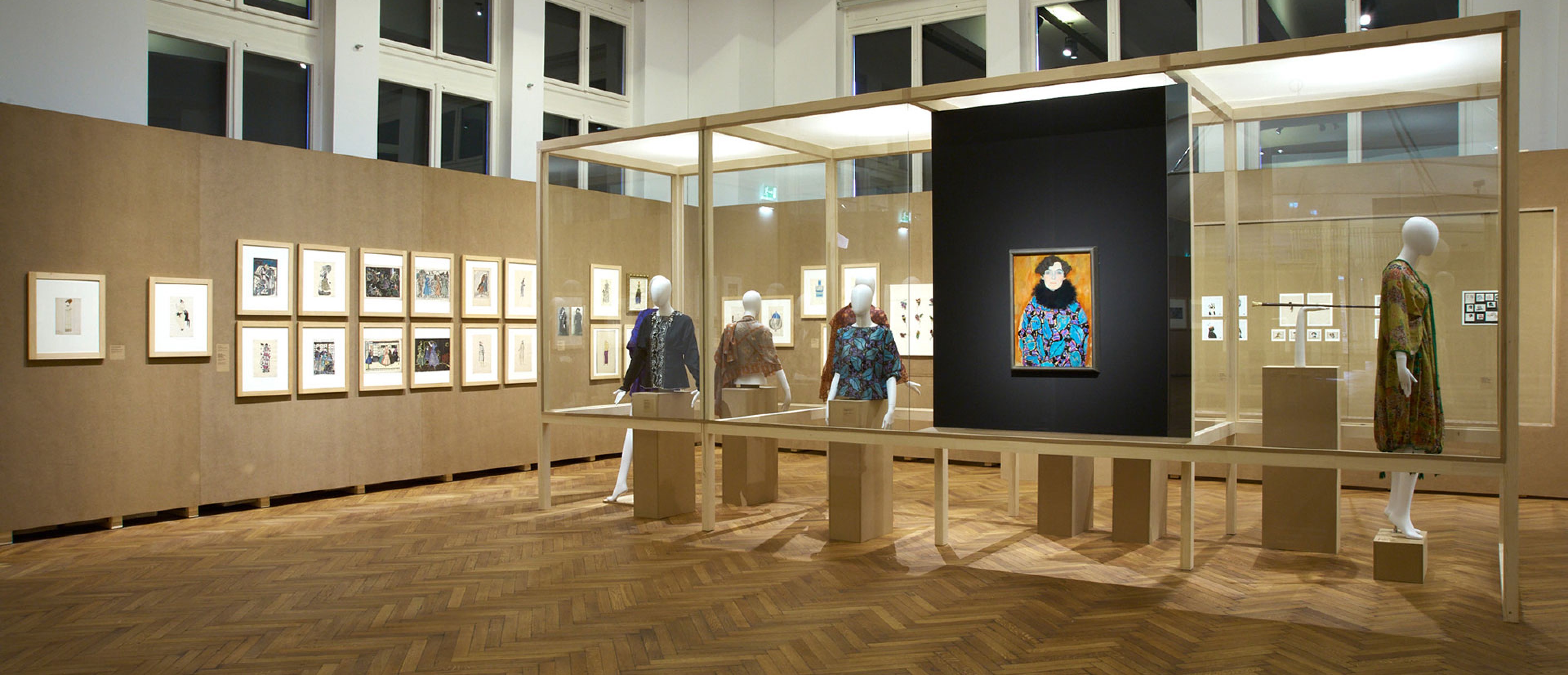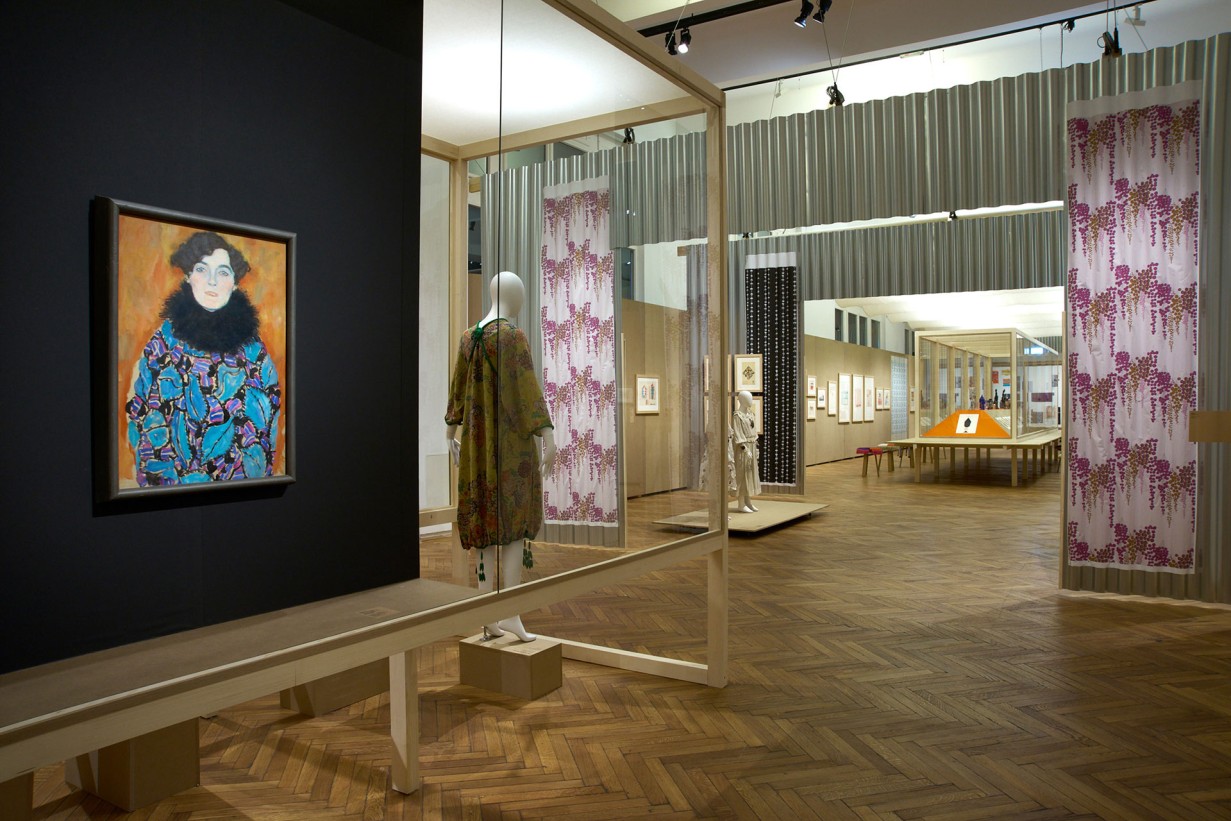 im Vordergrund: Gustav Klimt, Bildnis Johanna Staude (in einem Kleidungsstück aus dem WW-Stoff Blätter von Martha Alber), 1917/18