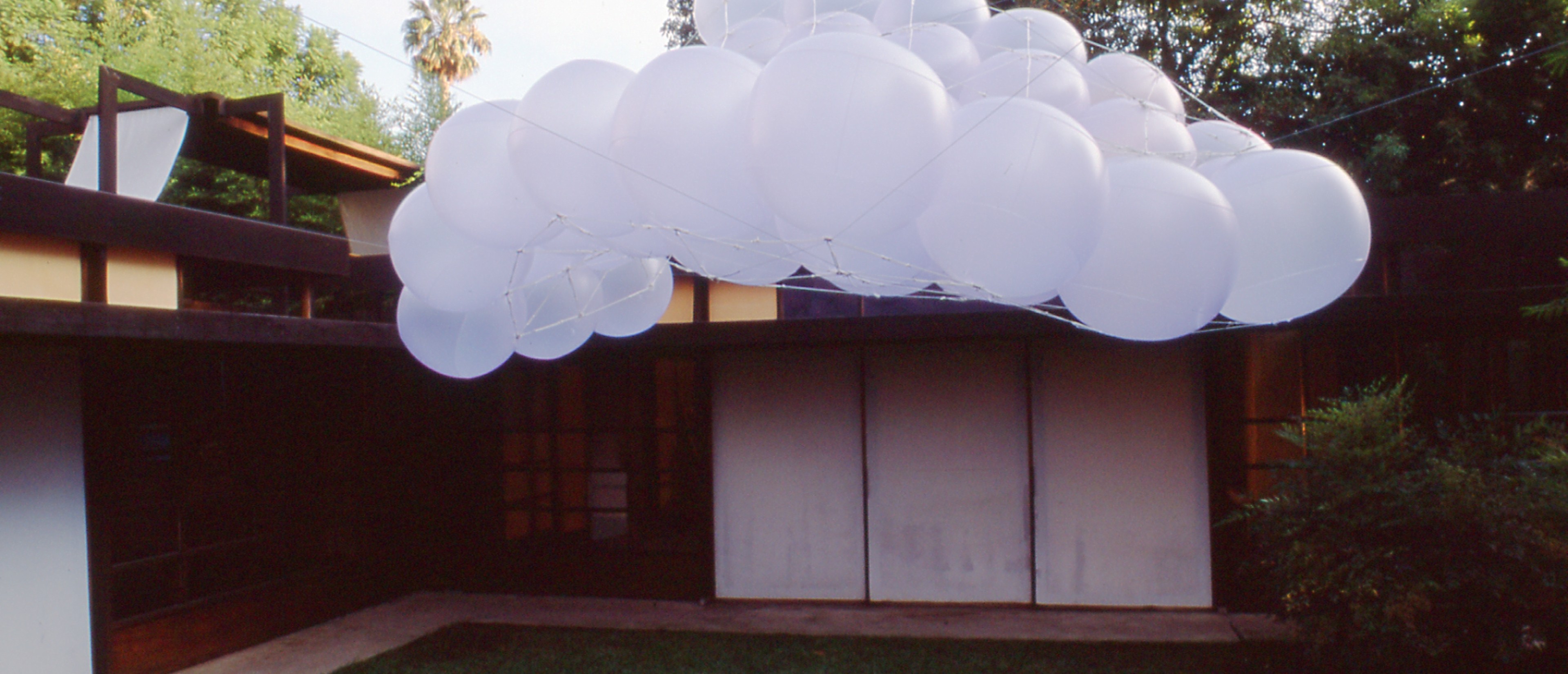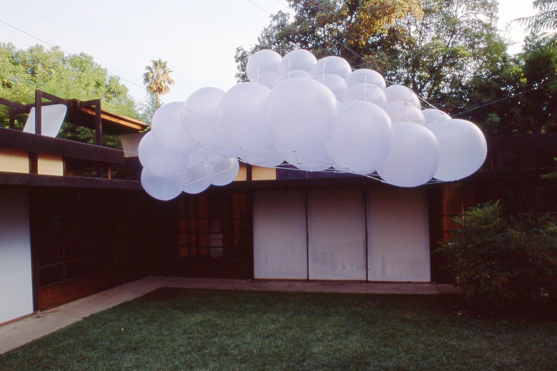 Architect Bernhard Sommer had been working since 1999 on his Transformer series, an attempt to make real the promise of a fluid architecture. Sommer approached the problem literally, devising computer-generated systems that could generate a diversity of shapes from a single construction. With "Desert Cloud: Transformer 3," he presented a model for an architecture light and changeable as clouds. Installed near one of the sleeping baskets on the Schindler House roof, the model existed simultaneously as a rendering of its construction technique and as a sculptural object. Inspired by Southern California topography, the work tethered together several balloon-like units with ropes that might be adjusted to create innumerable forms, according to the desires of the user.