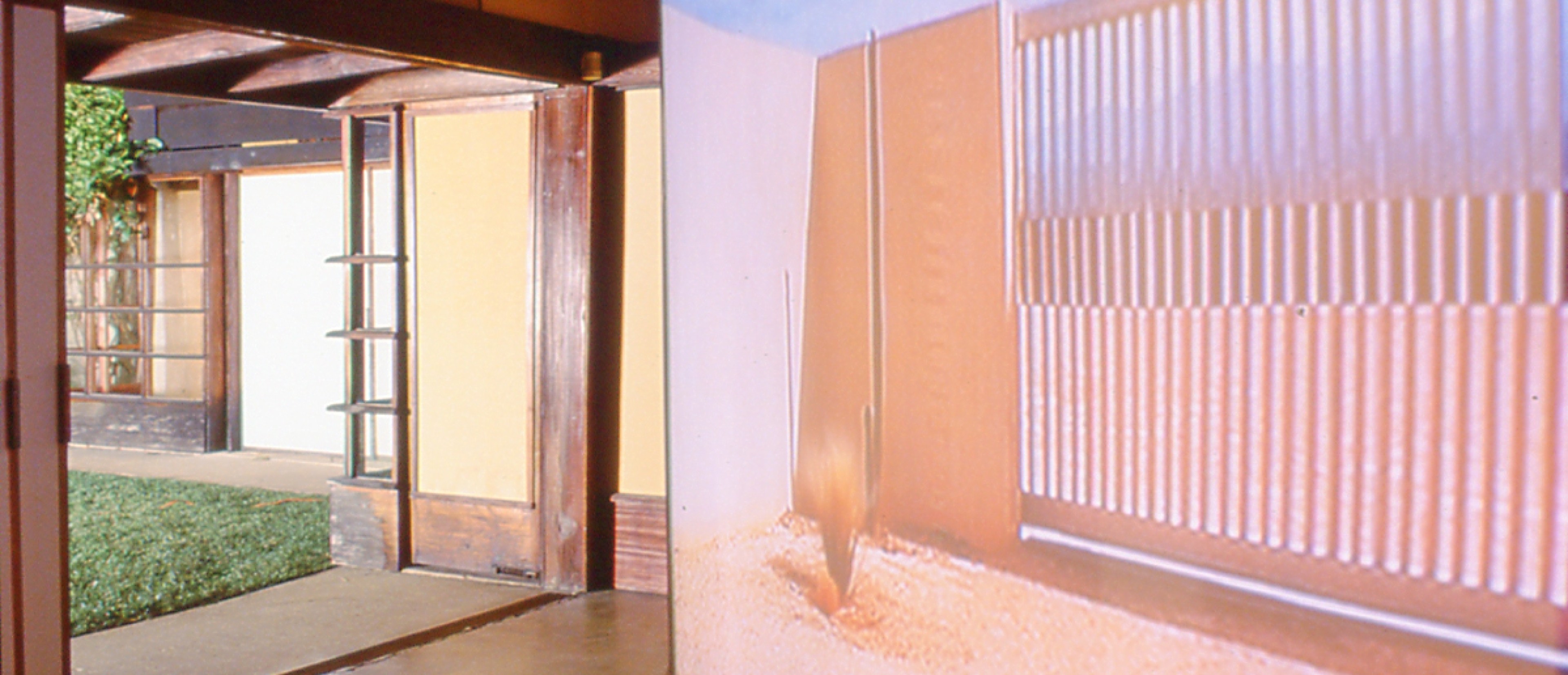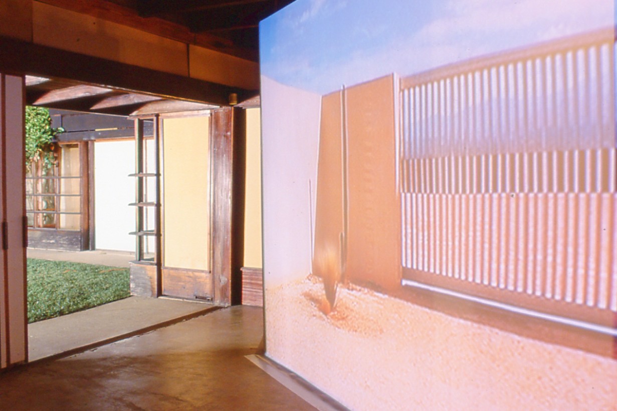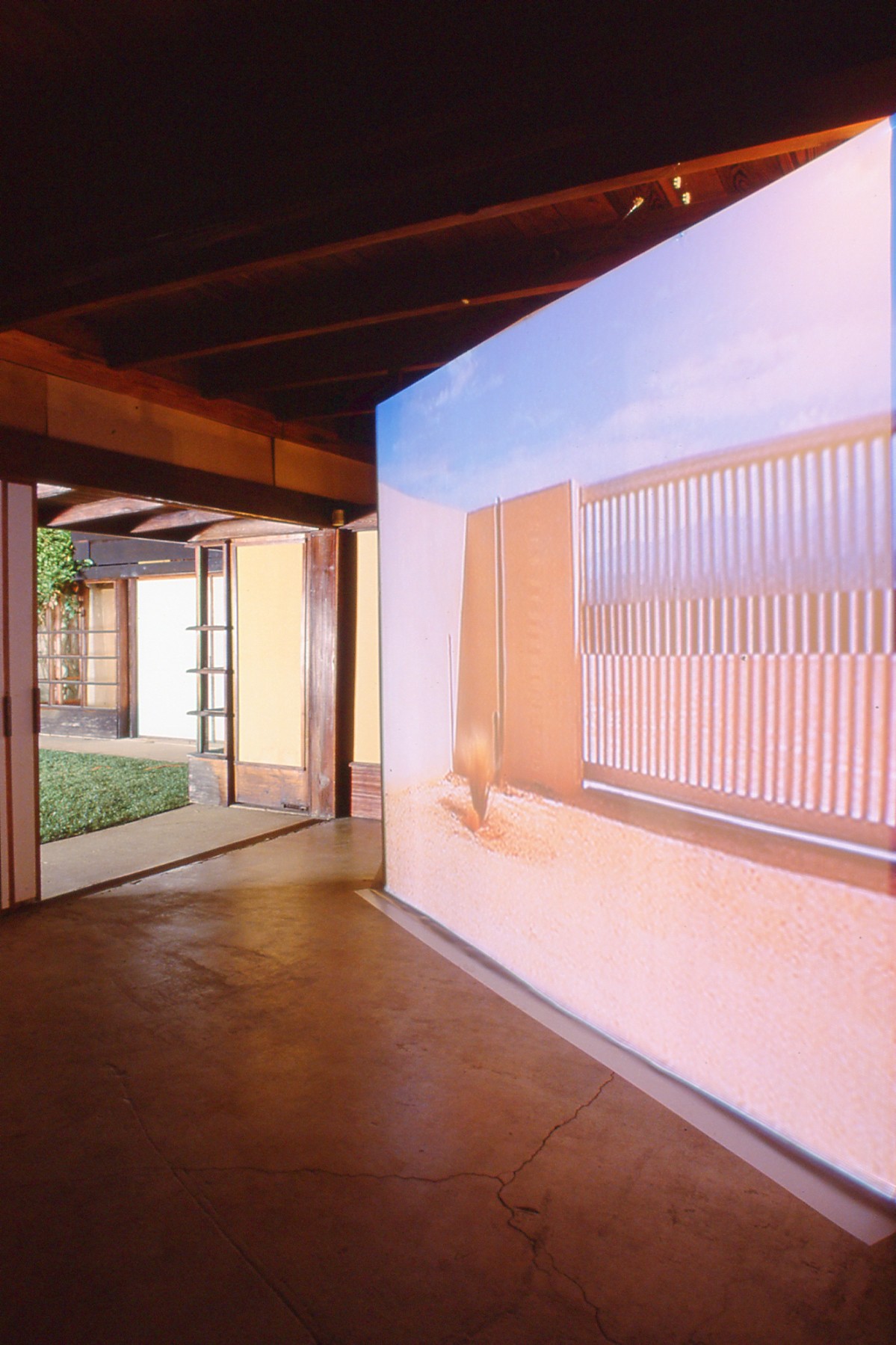 Artist Karina Nimmerfall engaged questions of mediation and manipulation through a sculptural installation on the grounds of the Schindler House. Through a series of projections onto the skin of her built structure, the work sought to confound questions of perspective. Using footage shot at Albert Frey's Tramway Station in Palm Springs, the work created a feeling of dissonance in the viewer that spoke to how built space is mediated by filmic reality, even as it confirmed the primary importance of the viewers perspective by breaking with ideas of illusionary pictorial space.