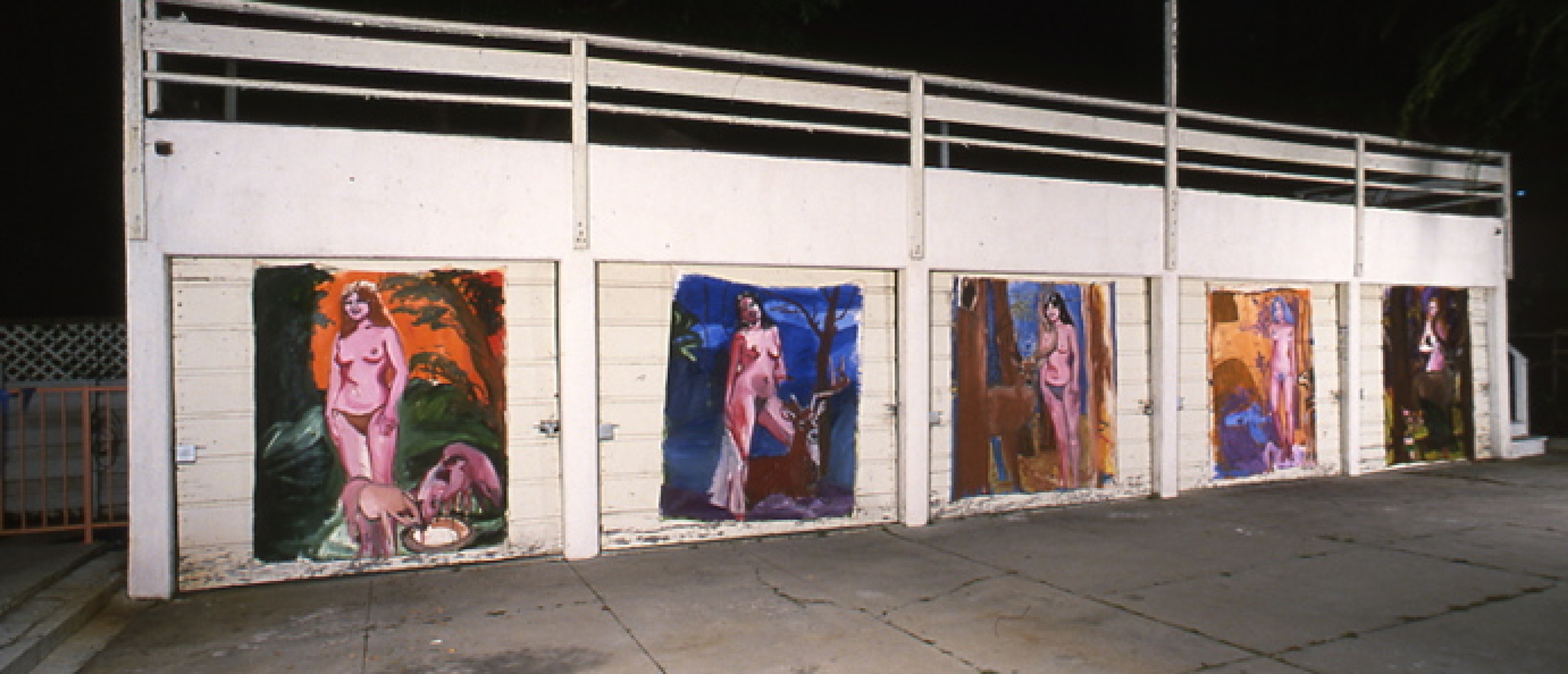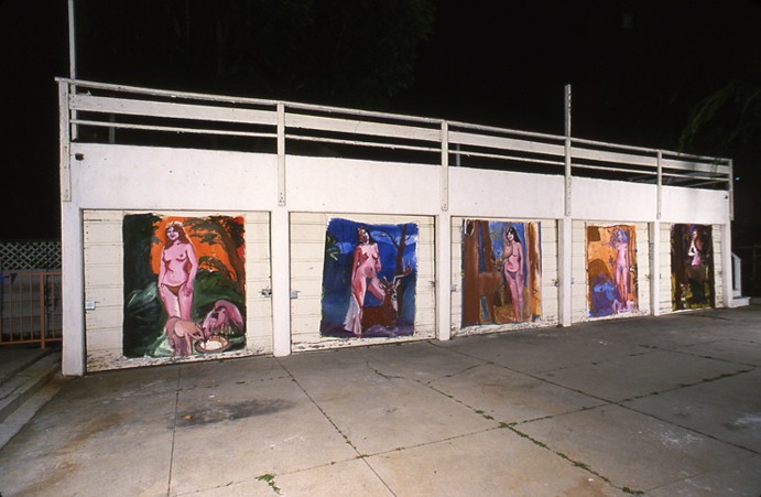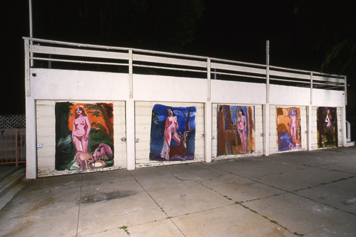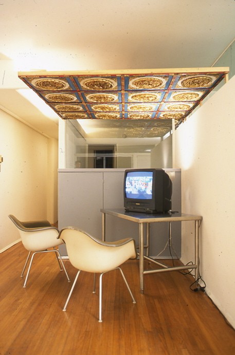 Austrian architect Sophie Esslinger presented several projects based on her experience in Los Angeles. In "pico boulevard," Esslinger documented a one-week walk along that thoroughfare utilizing an aerial photograph of the route in combination with pictures of details taken along the way. With "images," Esslinger projected descriptive passages lifted from film scripts onto the windows of the Mackey Apartments. Taken out of context, the sequence of the images resulted in a new story. "the carbench as a piece of urban furniture in los angeles" posited the creation of a new urban space for events, a plaza (or parking lot), furnished by the cars driven there. Esslinger's experience of L.A.'s car culture led her to design a "hydraulic platform for people in big car parks." Intended to provide perspective to a viewer lost in a sea of cars, the hydraulic platform also functioned as a bar.