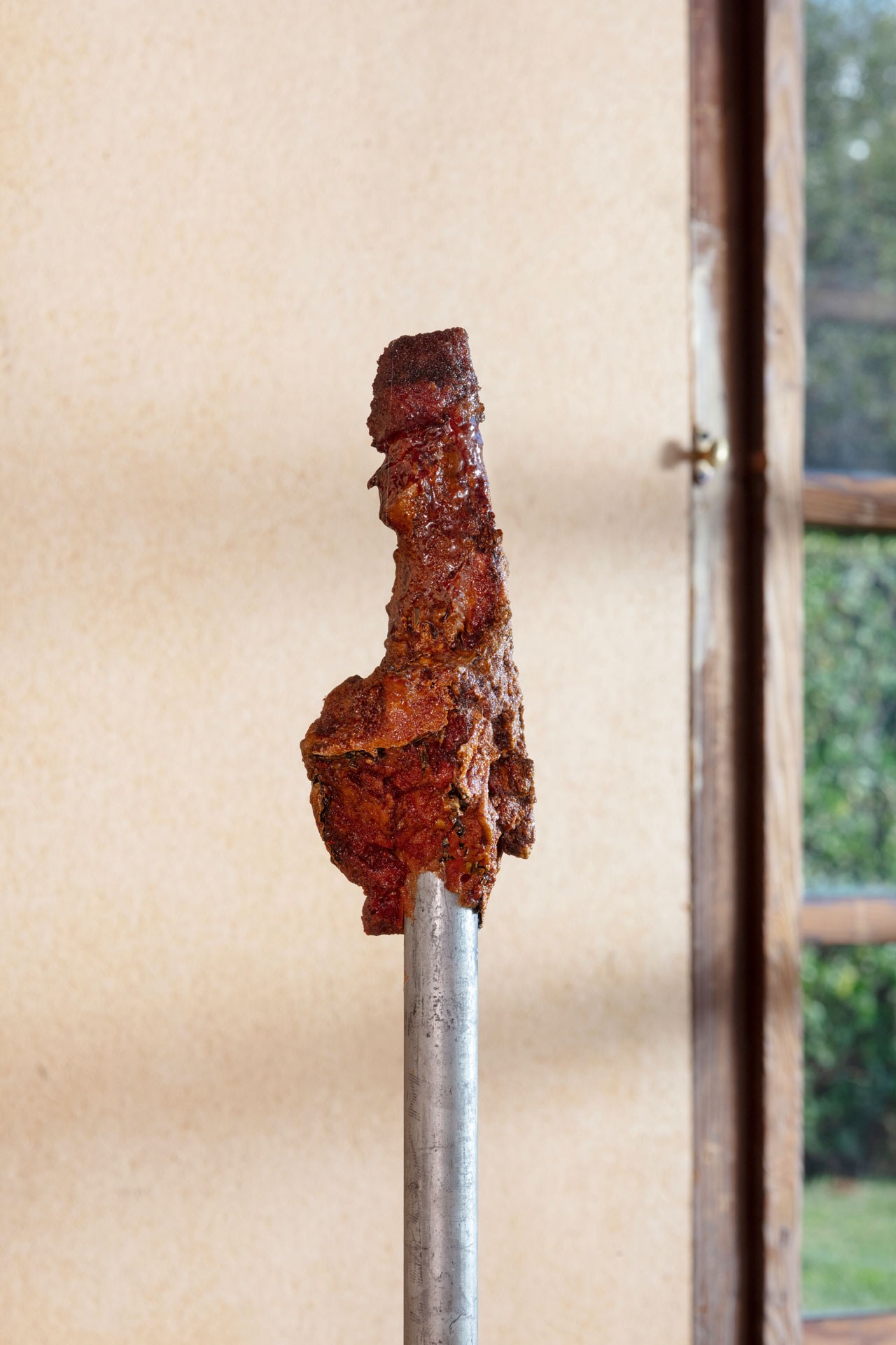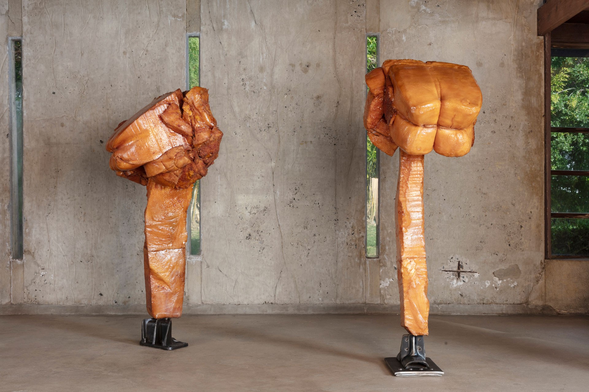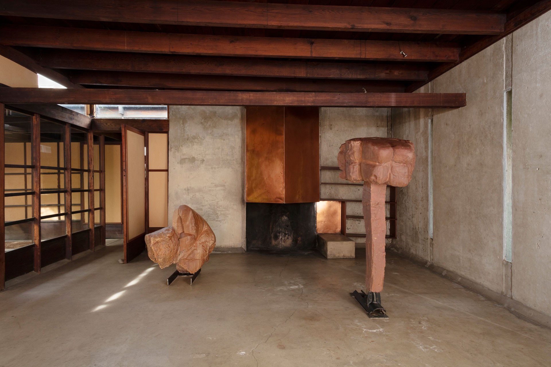 The historic house designed by fellow Austrian Rudolph Schindler provides the spare, proto-minimalist frame for a series of freestanding sculptures. Neither entirely figurative nor entirely abstract, they bring a fundamentally reductivist approach to material that is deeply impregnated with the burden of history. Sometimes this reads as a confrontation between the body and its past derelictions. At others the current is sexual, an accumulated tension that itself becomes a stand-in for human identity, vulnerability and desire. Always they occupy a liminal space where form is in a continual state of becoming.