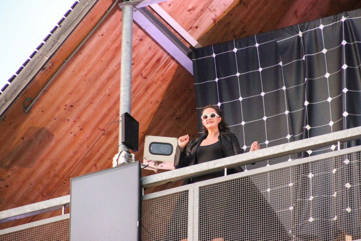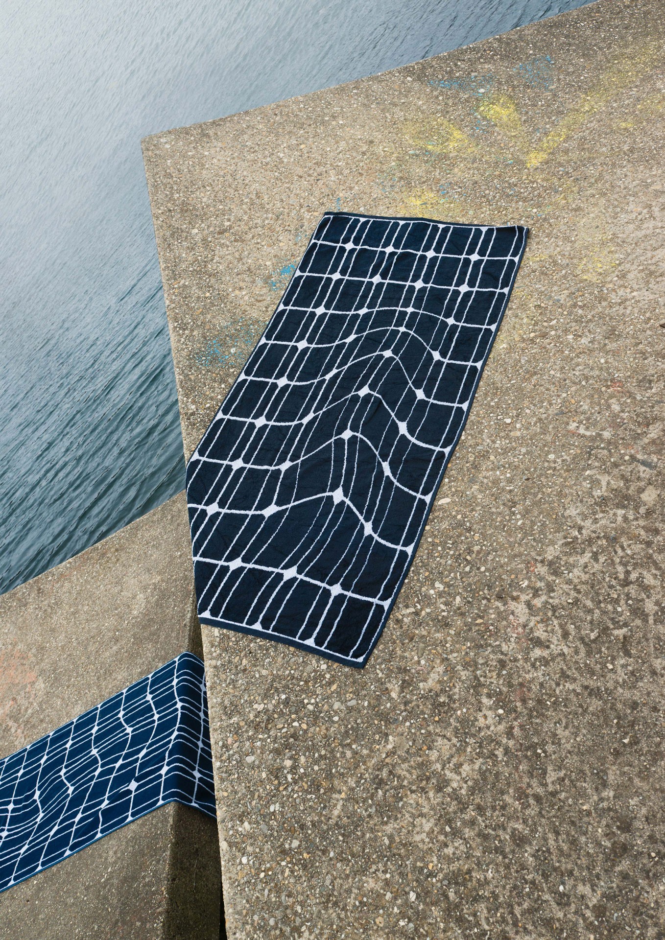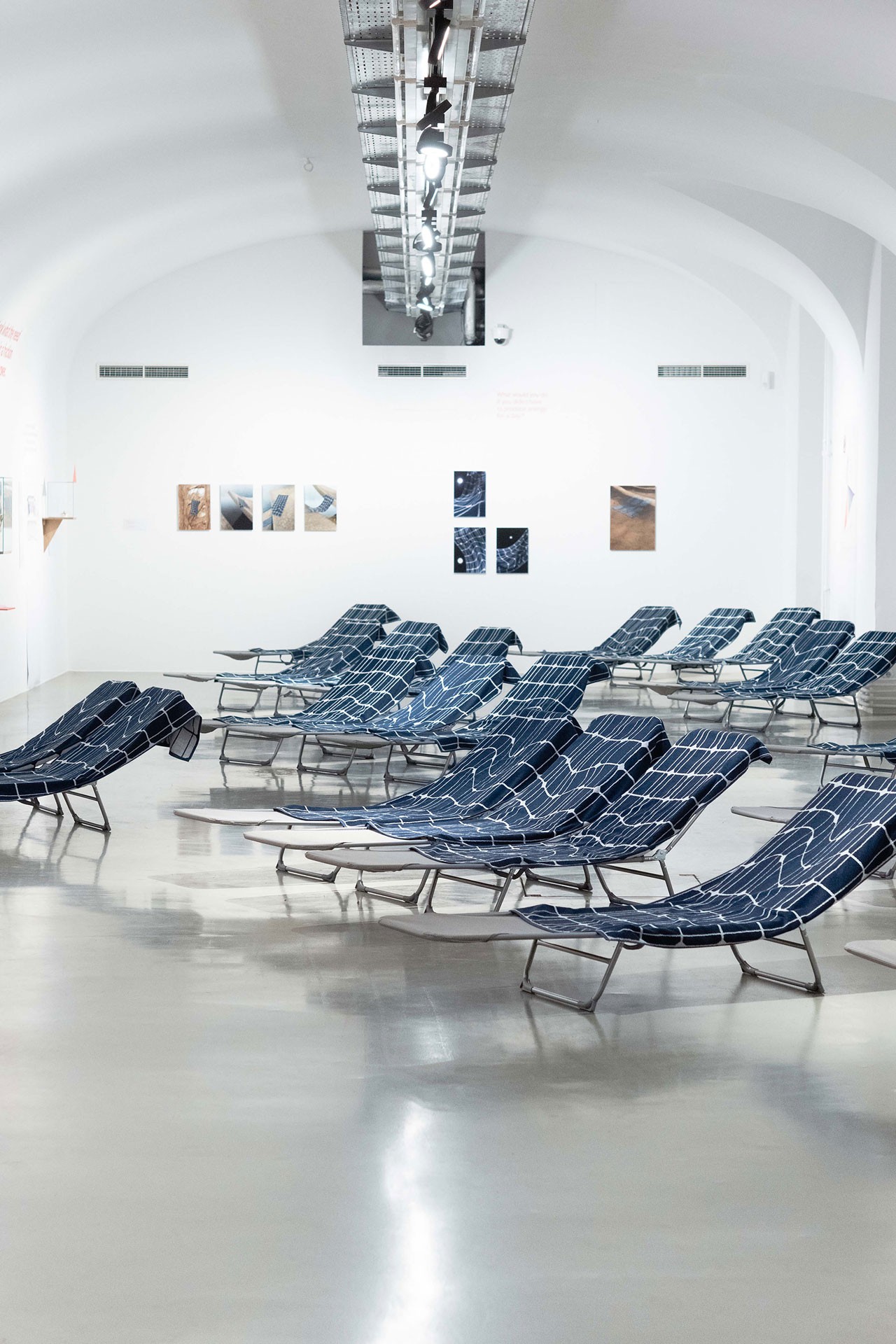 In ihrer Installation Copa Solar (2021) – ein Solarpark macht Urlaub – lädt Johanna Pichlbauer die Besucher*innen ein, auf ihrem „Sonnendeck“ Platz zu nehmen und die Kraft der Sonne zu genießen. Statt einer Halbleiterbeschichtung sind es allerdings weiche Frottierhandtücher, die die Unterlage für energiebringende Minuten der Einkehr bieten. Die Handtücher, die die Ästhetik von Solarpanels aufgreifen, ihre starren Raster dabei aber weich verformen, entwarf die Designerin in Kooperation mit dem Frottierwarenhersteller Vossen.