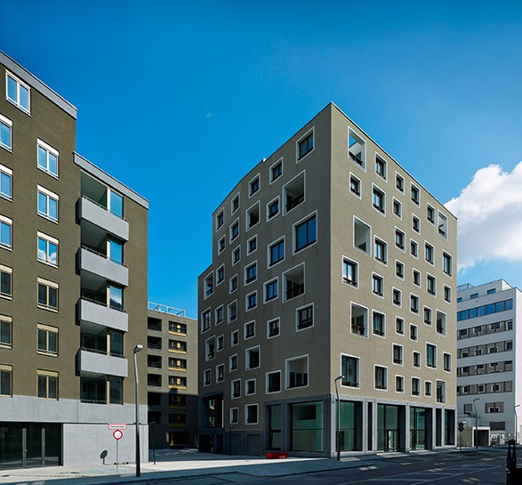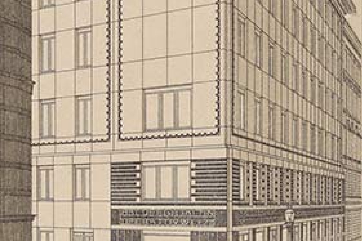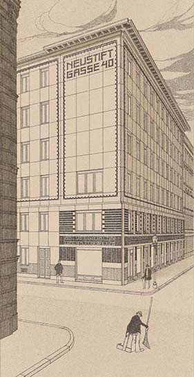 Im Vordergrund: Otto Wagner, Fassadenrekonstruktion des Depeschenbüros Die Zeit, 1902. Nach Plänen von Alfred Krischanitz und Otto Kapfinger, 1985, Wien Museum