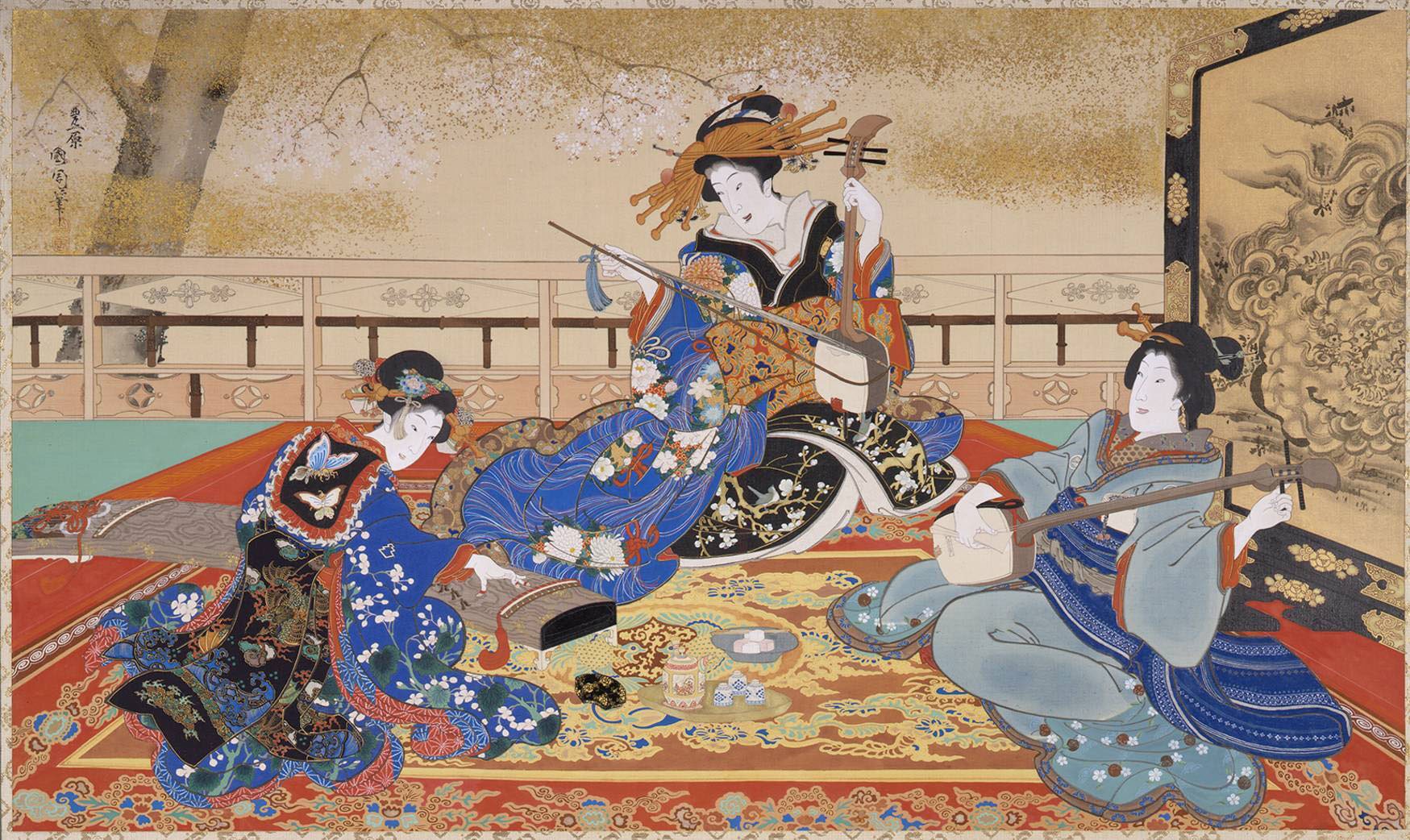 TOYOHARA Kunichika, drei musizierende Kurtisanen, Japan, vor 1872, Malerei mit Tusche und Farben auf Seide © MAK/Georg Mayer